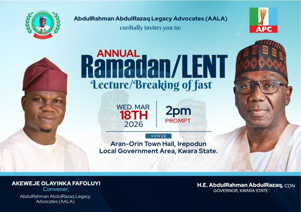 AbdulRahman AbdulRazaq Legacy Advocates (AALA) has announced that it will hold its annual lecture on Wednesday, March 18, 2026, at Aran-Orin Town Hall, Irepodun Local Government Area of Kwara State, by 2:00 p.m.